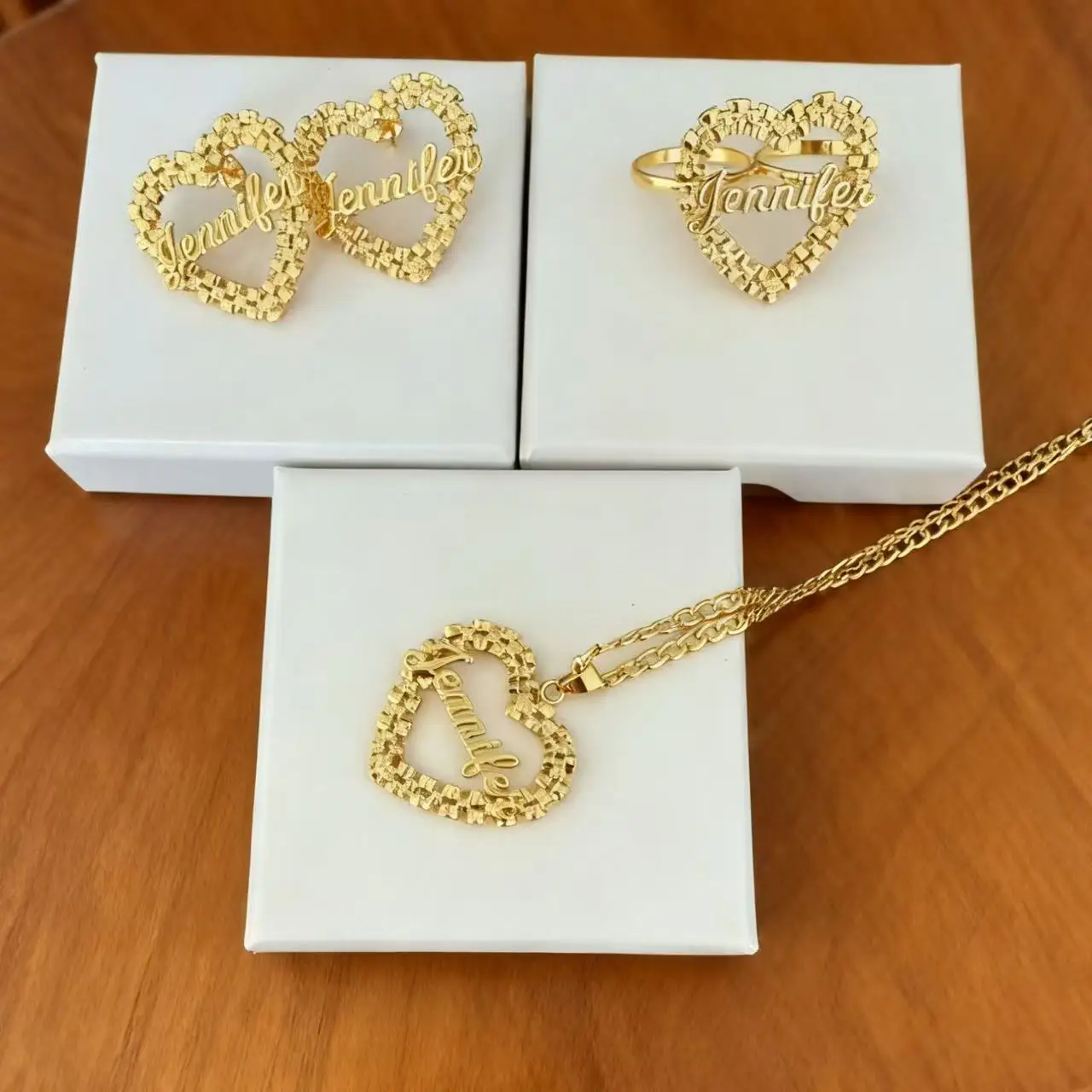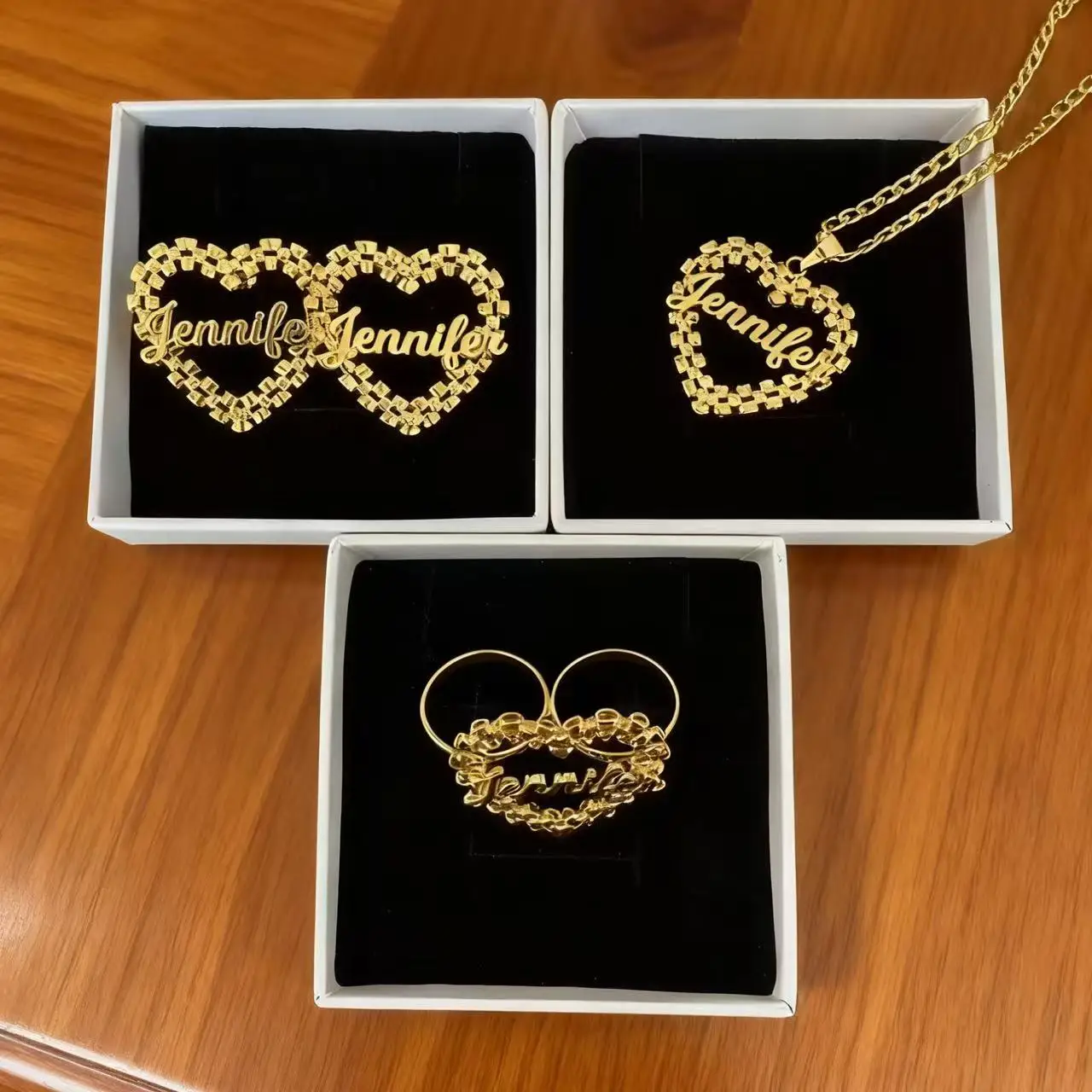 Welcome to our store! This custom name jewelry set includes a necklace and a pair of earrings. With the exquisite personalized name as the core design element and adorned with sparkling small diamonds, the whole set adopts a gold tone, which is fashionable and exclusive. It is very suitable for both daily wear to add personal style and as a gift for relatives and friends. It can easily match various dressing styles and add a lot to the look.